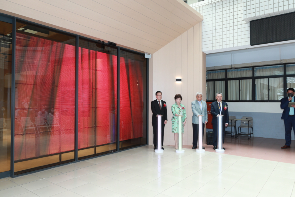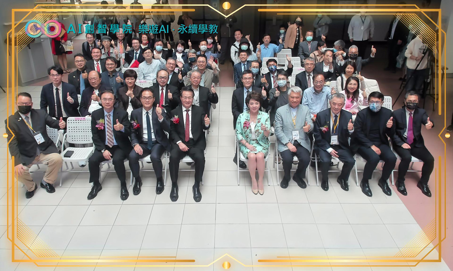 並由張家宜董事長、葛煥昭校長、陳進財董事長,以及王紹新董事長,一同啟用AI智慧互動牆。互動牆也將現場的貴賓與同仁瞬間呈現在元宇宙裡,現實生活中的本尊與虛擬世界中的分身一起參與盛會。